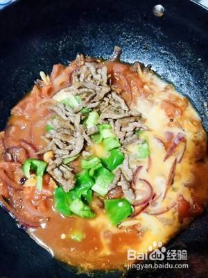 然后加入牛肉和青椒,1勺淀粉做成小半碗水淀粉,淋上去,拌匀,继续加热至稍微浓稠的状态,尝一下,根据自己的口味加适量的盐进行调整,然后拌匀关火(我吃合适我老公吃有点酸,他又加了半勺糖)
