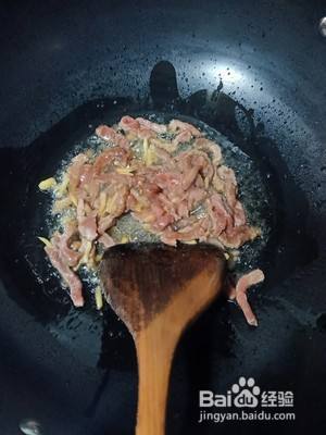 热锅冷油,放入腌制好的牛肉,翻炒至牛肉变色收缩盛出备用