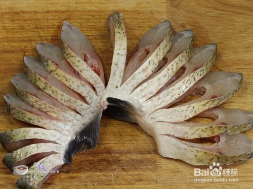 如图切片,每片约七八毫米厚,切到挨着鱼肚刨开口子约五毫米处不切断,有人做这个鱼的时候鱼肚没刨开来保存完整性,我觉得那样黑膜很难清理干净,破鱼肚的时候要切得整齐一点,这样便于好做造型。