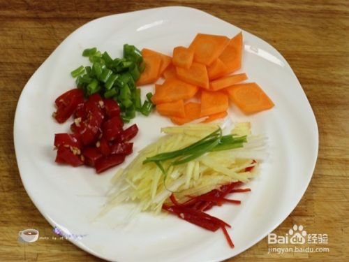 胡萝卜切成菱形片,泡椒切成小圈,大葱和姜切成丝,另一留一些大葱和姜切成片。