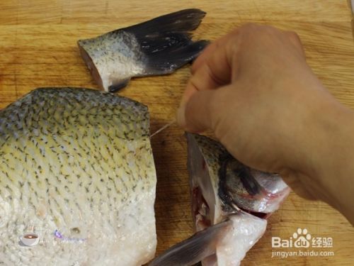 鱼内脏清理干净,黑膜去除,鱼头切下来,鱼尾不要,拍打鱼身,将两边的筋都抽出来,筋的腥味很重,将鱼的黑膜和筋去掉,鱼的腥味就会大大降低。