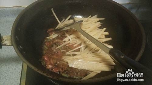 这个时候我们可以加入西红柿翻炒了记住,西红柿一定要多炒一会,让西红柿充分均匀的受热,让西红柿的块状完全变成汁状,让西红柿的色素充分进入汤汁中,然后就可以加入切好的土豆丝了。
