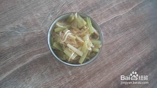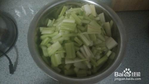 芹菜洗干净,去掉叶子,切成小段,记住可以把青菜的杆从中间劈开,这样切出来会比较薄、细一些的。还有,芹菜的叶子具有很高的营养价值的,不要丢掉,在做面食的时候放进去很美味的。淡淡的微苦,却也很是美味,夏季可以降火,同时给你的身体添加营养素。