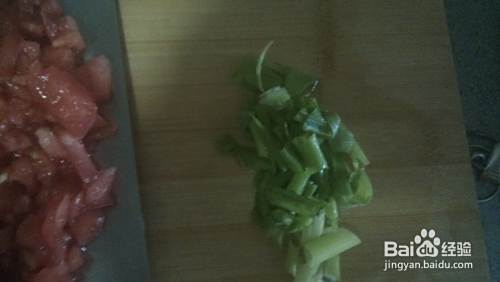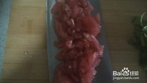 这个时候可以把葱洗干净,然后切成小碎块,把西红柿洗干净,然后把西红柿切成很小很小的碎块,如此一来,西红柿在翻炒的时候会更加容易出水,成汁状,变成西红柿酱。