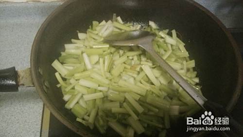 盖上锅盖,大概十分钟,锅里的水也差不多的干了,然后我们尝一下土豆丝差不多熟了的时候,我们加入今天 的主角——芹菜,芹菜不要放的太早,煮的太久,会让芹菜里的营养流失了。