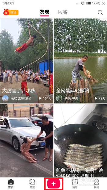 打开全民小视频,在全民小视频的推荐视频界面中点击底部的【+】按钮。
