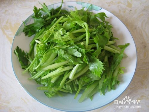 芹菜斜着切条,芹菜叶也留着,非常好吃的。