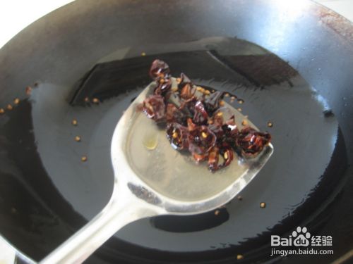 红椒炸出香味后,把糊的红椒铲出去