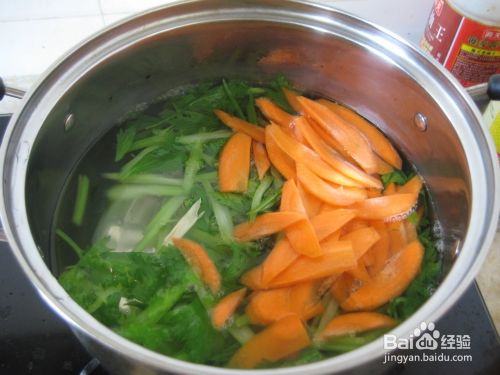 把芹菜和胡萝卜放开水里断生,然后捞出来