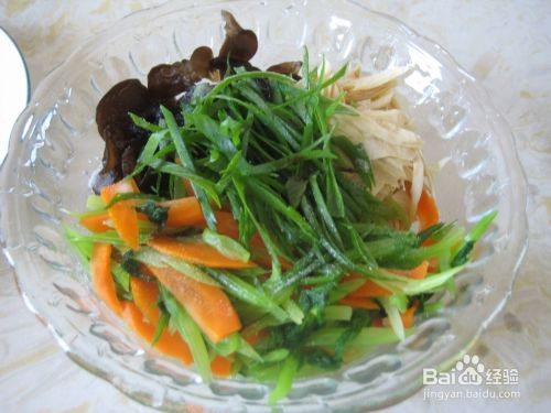 沥干水分后,把配料菜全放大碗里,撒上盐,倒些味极鲜,切好葱丝放上面