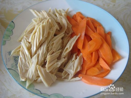 胡萝卜斜着切条,腐竹泡发后洗净,斜着切条