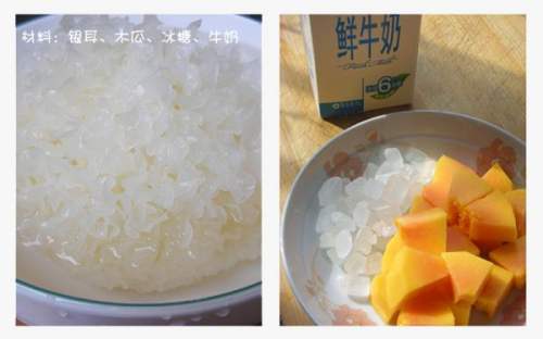 1主要材料展示:银耳提前泡发1-2个小时备用,木瓜去皮去核切成小块