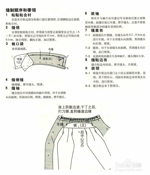 粘贴粘合衬、缝领、做口袋、缝侧缝、缝袖、装袖、缝里布、缝贴边布