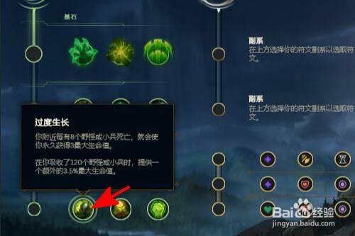 过度生长符文:每当8小兵或野怪死亡时,为英雄提供3点生命值,当死亡小兵或野怪达到120时,可以提高额外3.5%的最大生命值。
