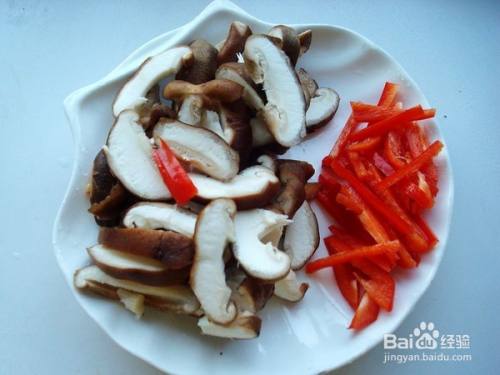 接下来,将香菇洗洗去蒂,用淡盐水一下,然后捞起来挤掉水分切成条,