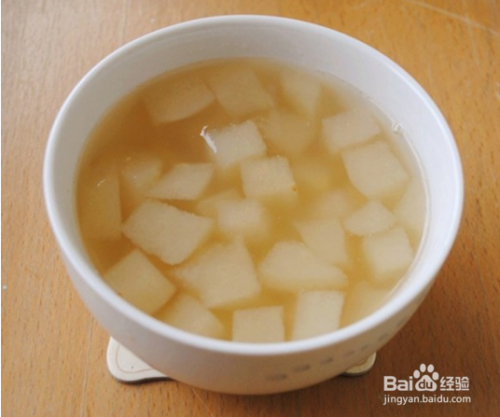 做法很简单:将一个大雪梨削皮、洗净、切小块,放进锅里,川贝大约30粒拍碎,冰糖啊一小块,加两大碗清水,一起倒进锅里,大火煮开,小火煮15分钟,就可以喝梨子汤了。