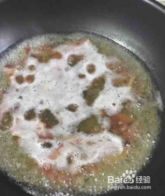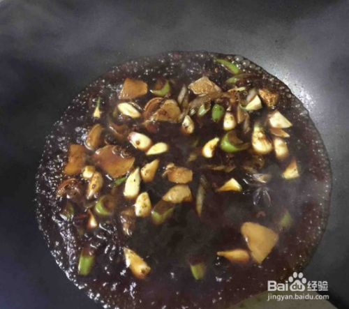 锅内的油炒制准备的配料,加醋、料酒、味极鲜。建议用白醋米醋,不要放酱油、我用了香醋,味极鲜,汤料黑了,影响色泽。