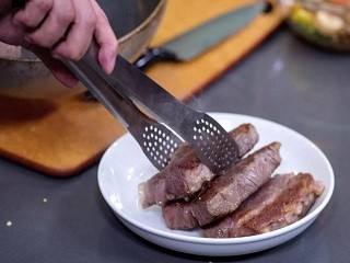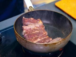 锅内倒入橄榄油,加热,放入牛小排,煎至两面金黄。