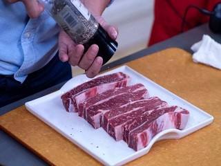 放上牛小排,撒上胡椒和食盐。