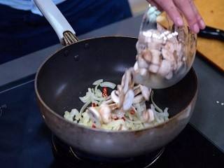 倒入尖椒和香菇,炒香。