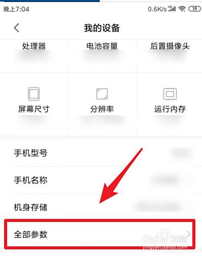 点击进入后,可以看到小米手机的参数信息,我们点击下方的全部参数。