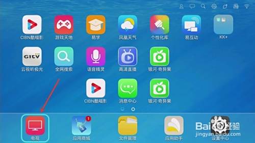 打开电视,智能电视开机都是电视的主界面,这里需要点击“电视”按钮。