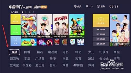 点击电视,就能进入iptv的首页了,然后点击“直播”。