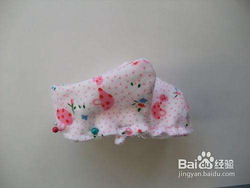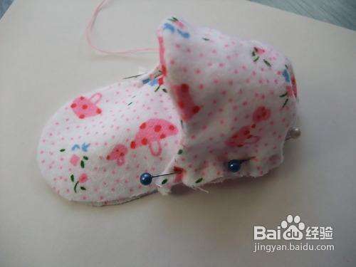 将鞋底的两个裁片里面相对,然后将鞋面如图和鞋底用珠针固定,然后缝合。注意鞋面的抽褶要集中在鞋头部。