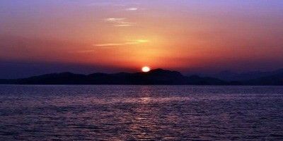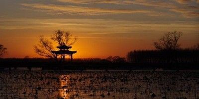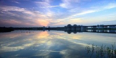 拍出夕阳除了与水、云等的其他参照物的关系构图。比如与树木、桥亭等的关系构图。
