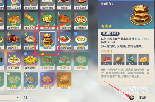 进入原神,玩家可以打开烹饪界面,选择堆高高食谱,切换制作角色为迪卢克并点击制作即可获得特殊菜肴增加暴伤