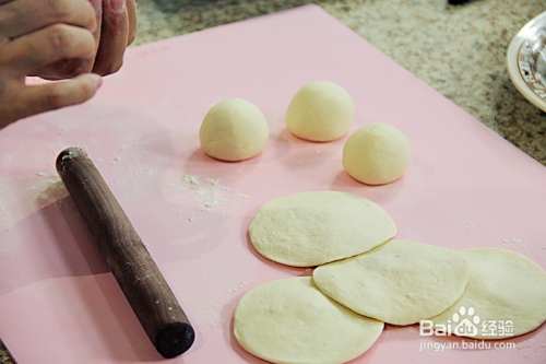 然后将面团搓成长条,均匀分成面剂子,用擀面杖擀皮。