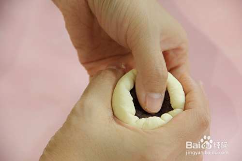 在面皮中放入红豆馅,掐褶收口,静置5-10分钟。