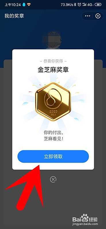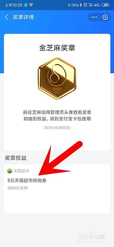 我们即可获得金芝麻奖章,在底部还可查看是否抽到权益,可到卡包查看。