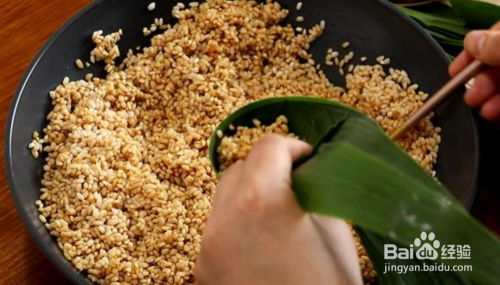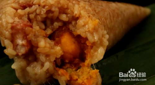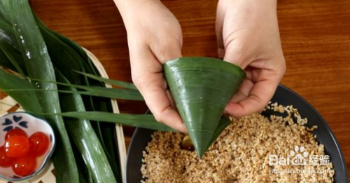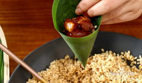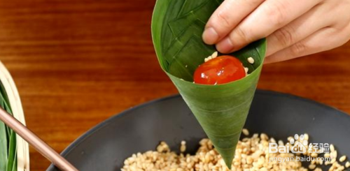 取三至四片粽叶,把粽叶卷成一个圆锥状。先舀入一勺糯米。放入一个咸蛋黄和一块五花肉,再盖上一层糯米,把上面竖着的粽叶压下来,在最前端处往一边折。沿着粽子的折路把粽叶继续裹。(裹好的粽子尽量不要有糯米露在外面)