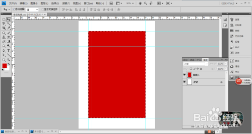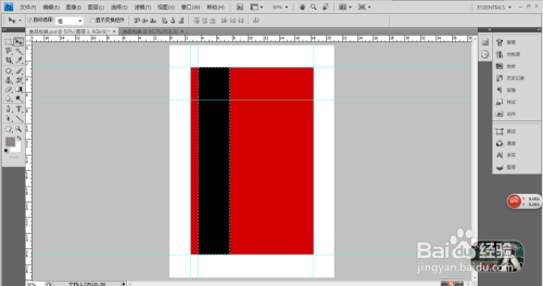 再新建一个图层,使用矩形选框工具,在规划好的参考线范围内,可以很轻松地创建出一个与红色矩形上下对齐的选区。在选区内填充上黑色。