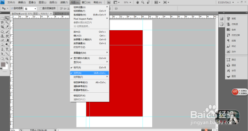 取消选区后,在视图菜单中将“标尺”选项勾选,操作视图中即会出现标尺显示。使用光标按鼠标左键从标尺上向视图中的红色矩形拖动,由于“对齐”选项默认为勾选状态,所以拖动出的参考线会自动与矩形边缘对齐。