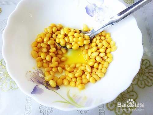 泡好的黄豆控去水分,放入一个生鸡蛋黄拌匀