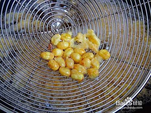 在热油,把晾凉的黄豆在大火复炸一遍,这回可以尝下,炸透酥脆了就可以捞出享用