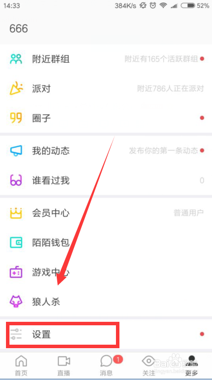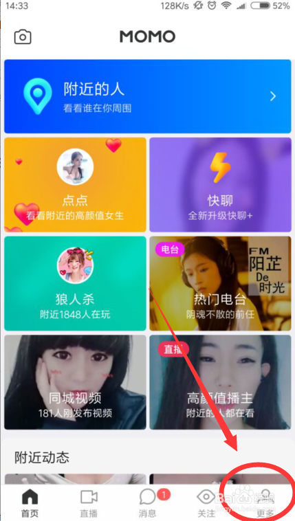 1、首先我们先微信登录陌陌app,在陌陌app首页我们可以看到右下角有个更多,我们点击它。