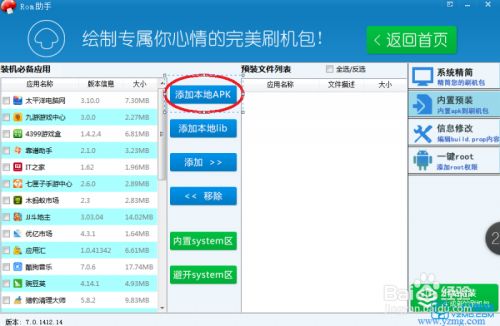 2.用ROM助手打开ROM包,选择内置预装----添加本地APK,将superuser添加到ROM包中。