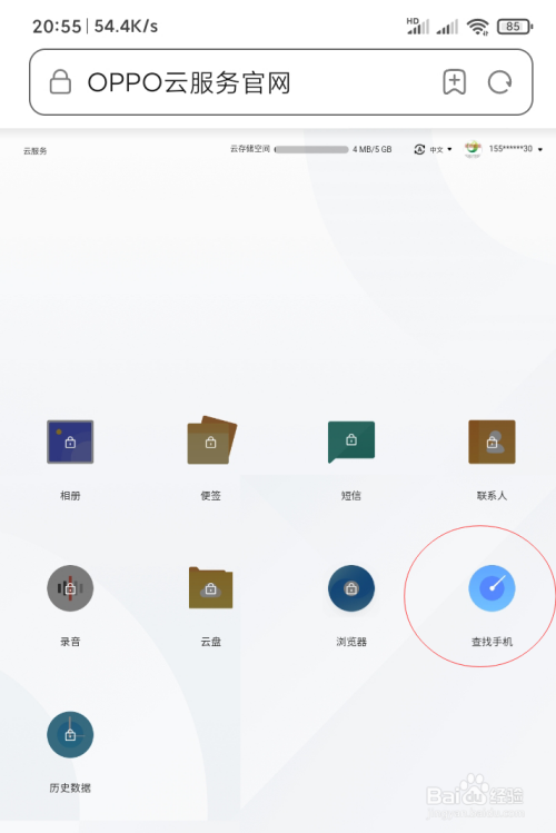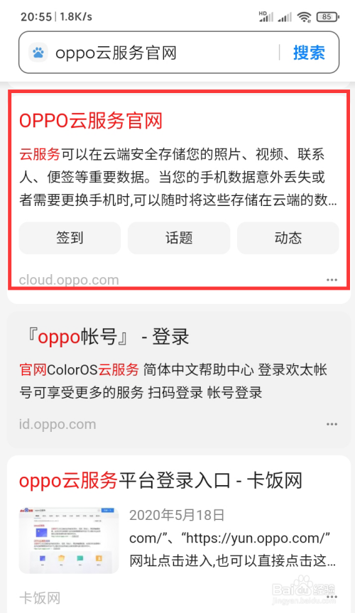 打开手机浏览器,输入OPPO云服务进行搜索,点击第一个。