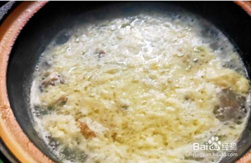 3.将鸡蛋打入一个空碗,将蛋液搅拌均匀后,边搅拌锅中的汤,边逐步将蛋液倒入锅中,使其形成蛋花状。再加入适量的盐和葱花,调味后关火,起锅,好吃美味适合养生的香菇山药蛋花汤就做好了。