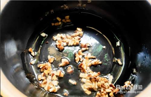 加入玉米油,等油温升高后,放入提前泡发好切碎的香菇,煸香。