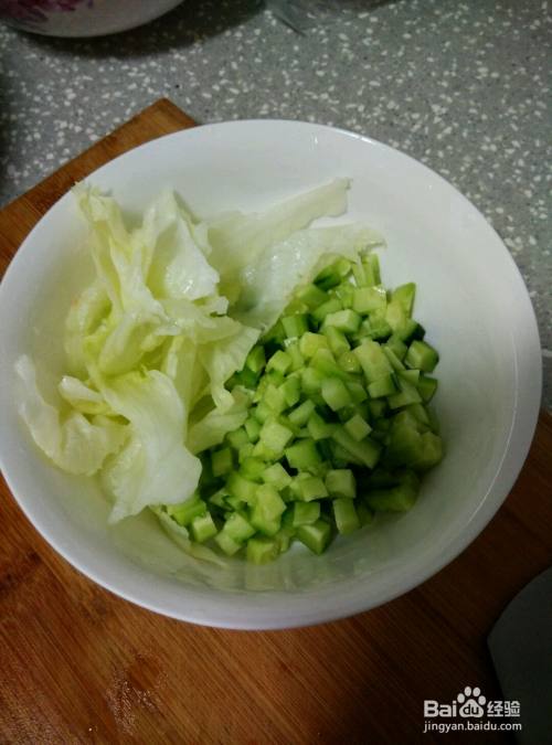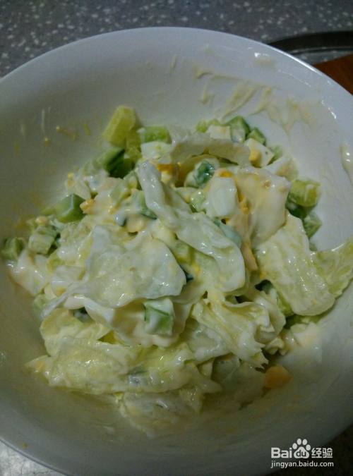 1个煮好的鸡蛋,切成小丁,放入刚才的黄瓜碗里,加入适量沙拉酱,搅拌均匀。