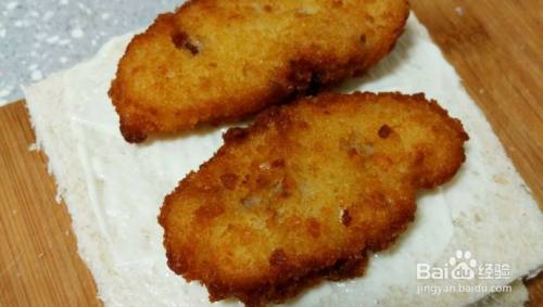 第二片盖到第一片上,再把炸好的鳕鱼放上去,最后再把第三片有沙拉的一面盖到鳕鱼上,从此,鳕鱼沙拉就做好了。最后的成品还没来得及拍照就被等不及的宝贝直接抢走咬了一口,所以就没有图了。呜呜呜呜呜