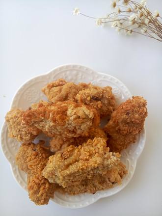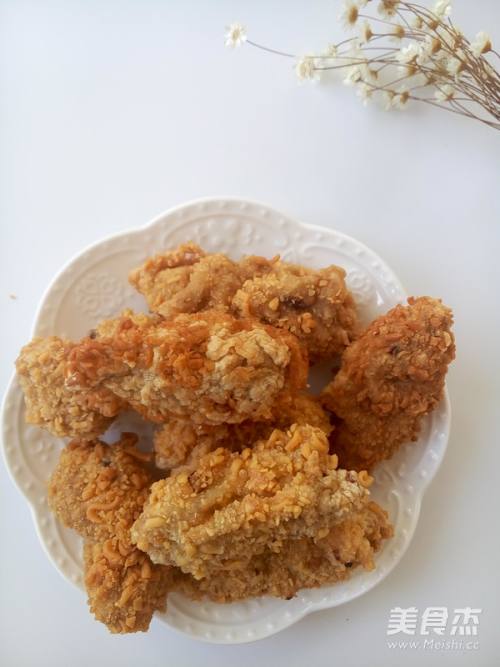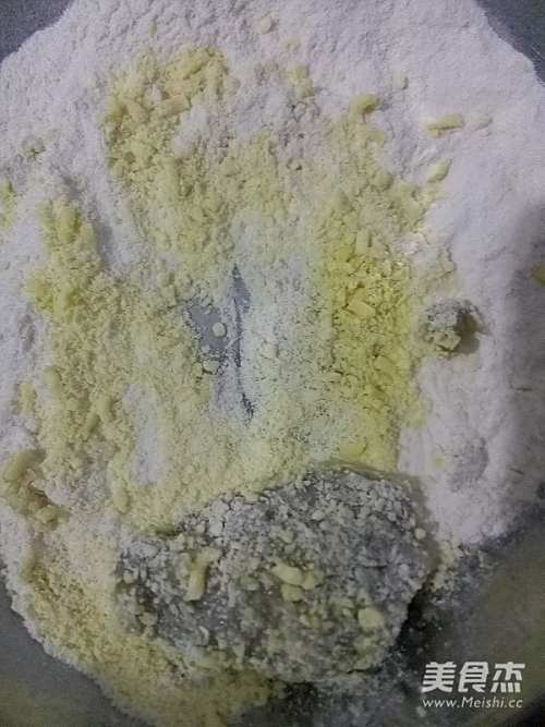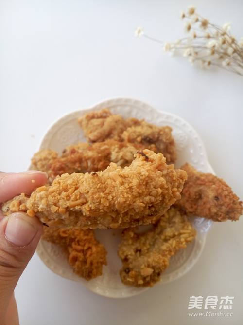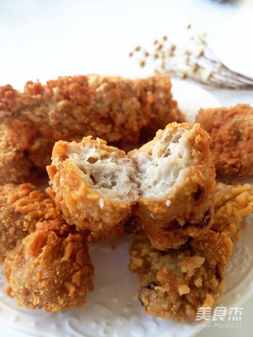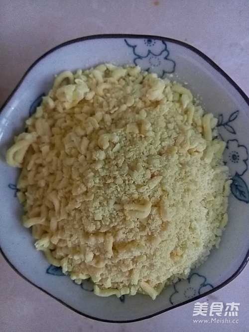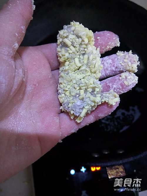 5用勺子挖一勺肉泥,在淀粉和方便面碎里滚一下,让鱼肉泥周围包裹上面粉和方便面碎