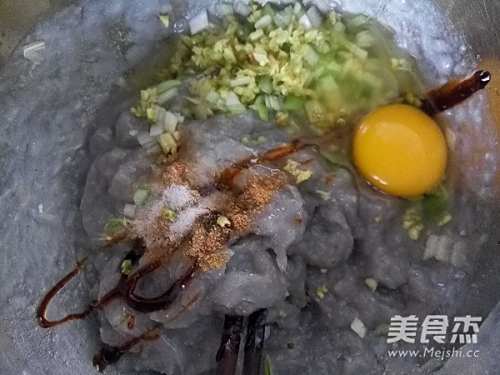 3在鱼肉泥中放入葱姜末,盐,十三香,蚝油,再打入一个鸡蛋,搅拌至上劲