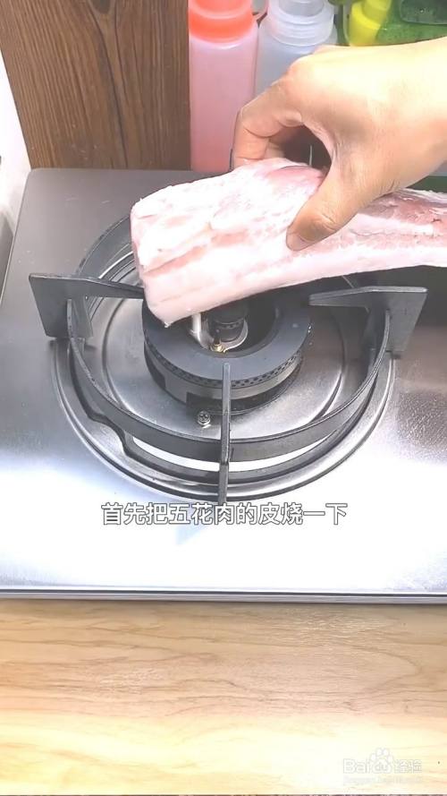把五花肉的皮烧一下,洗干净,冷水下锅。放入料酒。煮20分钟,捞出来之后,切成厚片