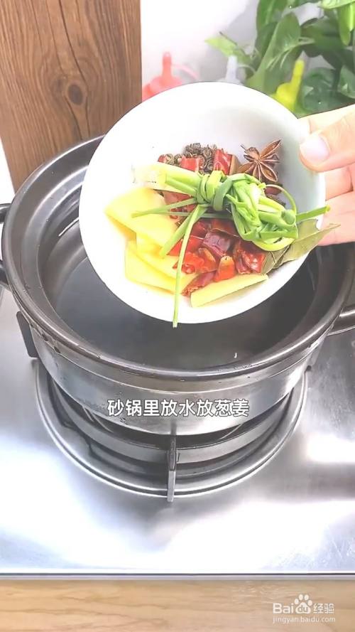 砂锅中放水,放葱姜。八角,桂皮,香叶,花椒,干辣椒。酱油,蚝油,盐,鸡精,白糖,胡椒粉。料酒,老抽