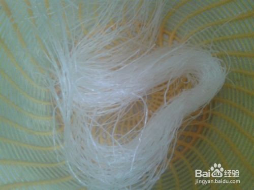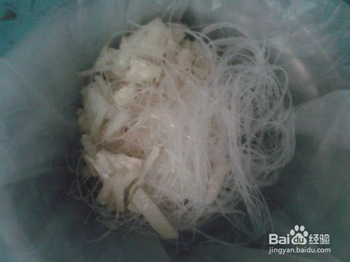 然后把泡软了的粉丝弄断和炒好的马蹄水豆腐一起放入摊好保鲜袋的碗里。